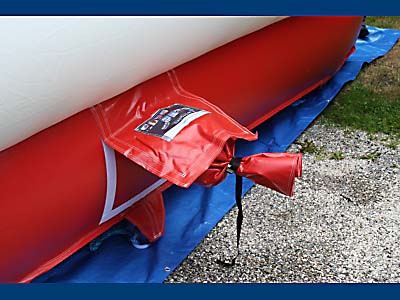Achtung wichtig (siehe Abbildung 2): Zum Aufblasen bitte die 2 seitlichen Luftablassöffnungen ( 1 links, 1 rechts) mit dem daran festgemachten Gurt zumachen. Beim Ablassen der Luft (nach Betrieb) diese Gurte wieder aufmachen!!