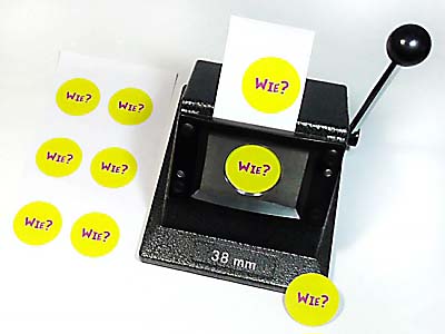 59 mm Durchmesser, Papiervorlage 69 mm Durchmesser, mit Zirkelschneider u. Schneidunterlange, im Koffer. Sehr beliebt bei Kinderfesten. Rohmaterial zu 0,15 € / 0,20€ pro Stück erhältlich.