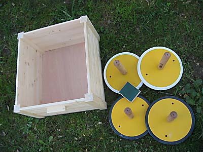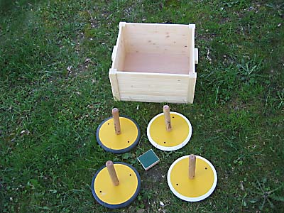 Bestand: 1 Set bestehend aus 4 Eisstöcken aus Holz mit hellem Bodenbelag (für Außen) und einem Zielpuck.