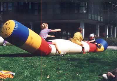 Der ultimative Spaß für alle Kindergeburtstage und Vereinsfeiern. Die 4m bzw. 5m lange, aufblasbare Luftschlange ist für innen und außen (hier nur auf sauberer Rasenfläche) zu verwenden. Höhe des Wurms ca. 60cm, farbig unterteilt. Mit dem mitgelieferten Handgebläse (Stromanschluß!) ist der Wurm in 10 Minuten aufgeblasen und wird vorne und hinten mit einem Stöpsel verschlossen. Nach etwa 1 Stunde kann ein kurzes Nachfällen der Luft notwendig sein. Nicht zu prall aufblasen !