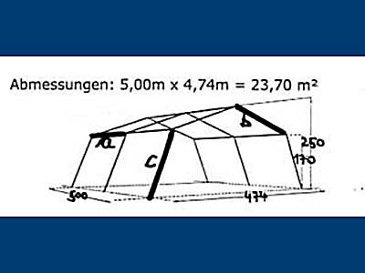 für ca. 12 Personen 18 Stangen, 6 Bodennägel, 3Stk. 4-weg und 6 Stk. 3-weg Gelenke, Bodenplane, Schlafmöglichkeit für 12-14 Personen Farbe: oliv, Zelthaut-Material: Schwergewebe (440g/qm), 50% Baumwolle, 50% Polyestergarn, Gewicht: 40 kg Zelt mit Eingang im Vordergiebel (Knebelverschluß), Fenster 40×60 cm mit Außenklappe im Hintergiebel. Gestänge: 18 Stangen (maximale Länge 244 cm, wichtig für Transport!!!), 6 längere, 6 kürzere, 6 Bodenstangen mit Teller, längsnahtgeschweißte Aluminiumrohre, Durchmesser 40 mm, Gelenke: 9 Stück (6 Stück 3-arm und 3 Stück 4-arm), Rohrverbindungen aus widerstandsfähigem Durethan-Kunststoff. Dazu bei Bedarf – wenn das Zelt zum Übernachten verwendet wird – passend Bodenplane aus beidseitig beschichtetem Polyestergewebe, wasserdicht, Gewicht: 15 kg. Zubehör: 6 Bodennägel zur Verankerung der Bodenstangen im Rasen, Packsäcke für Zelthaut, Gestänge, Zubehör Anmerkung: Beim Aufbau beachten, daß die längeren Stangen für die Länge und die kürzeren Stangen für die Breite hergenommen werden.