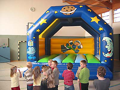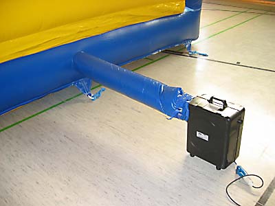 Schuhe ausziehen und rein ins Vergnügen. Der Dauerbrenner bei groß und klein, hier wird stundenlang gehüpft und gesprungen, ohne Verletzungsgefahr durch Polsterung auf allen Seiten, Größe 5,5 x 5,5 Meter (empfohlen für 8-10 Kinder), mit Unterlegplane, Dauergebläse (permanenter Stromanschluss erforderlich).