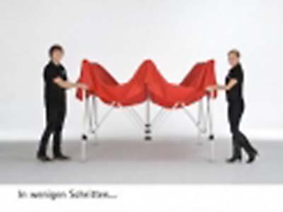 Einfach und schnell, 2 Personen, 2 Minuten: Zum Aufbau einfach auseinanderziehen und Füße ausfahren (siehe Abbildung rechts)!