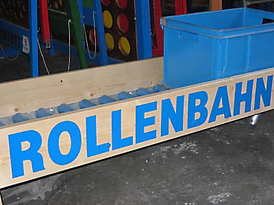 Rollenbahn zum Runterrutschen in Kisten. Ein Super-Spaß für alle Kinder von ca. 4 – 12 Jahren. 3 Bahnen zu je 1,5 Meter = 4,5 Meter Länge zum Rutschen! Gesamtlänge mit Tisch, Aufstiegsstufen und Auslaufbrett: 6,5 Meter!