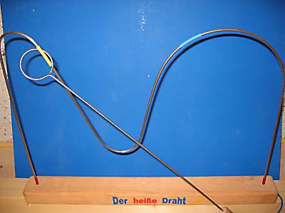 Konzentration und vor allem eine ruhige Hand erfordert dieses amüsante Spielgerät, das bei Erwachsenen auch scherzhaft Alkomat genannt wird. Aufgabe des einzelnen Spielers ist es, mit der runden Öffnung des Kontaktarmes entlang zu fahren, ohne den gebogenen Metallstab zu berühren. Jede Berührung wird schonungslos durch ein Hupsignal aufgedeckt. Höhe: ca. 40cm.