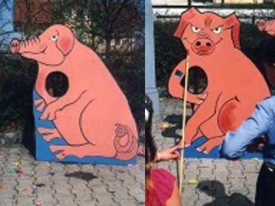 Von der Spielidee her gleiche Spiele, Drachenstechen als Teil der Ritterspiele einsetzbar: die Spielleitung bläst Luftballon auf und klemmt diesen in die Rundung beim Schwein (Drachen). Spieler setzt eine abgedunkelte Brille auf (noch besser ist ein alter Helm mit abgedunkeltem Visier) nimmt Maß, geht ca. 5 Schritte zurück, Visier herunter und er versucht nun im langsamen Vorwärtsgehen blind sein Ziel zu treffen. Trifft er, platzt der Ballon, geht´s daneben, Visier hoch… ! Transportmaß Drachenstechen 1,25mx2m