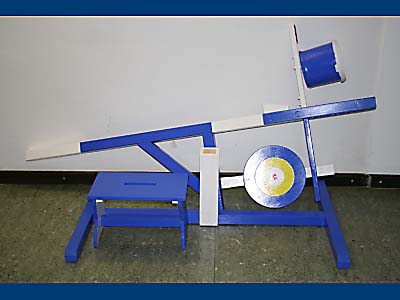 Nichts für Stinktiere. Dieses neuartige Zielwurfspiel ist nur für heiße Sommertage geeignet, wo eine Abkühlung jedem willkommen ist: Ein Spieler sitzt auf dem Hocker, ein weiterer Spieler wirft aus entsprechender Entfernung (variieren) auf die Zielscheibe. Wird diese getroffen, klappt die Entriegelung nach hinten, wodurch das andere Ende mit dem blauen Eimer nach unten kippt! Aber keine Angst – der Eimer ist fest verschraubt, er kippt lediglich so nach unten, dass sich das Wasser, das sich darin befindet, über den unten sitzenden Spieler ergießt! 3 Versuche, dann wird gewechselt. Höhe ca. 220 cm, für Transport zerlegbar (siehe Abbildungen).