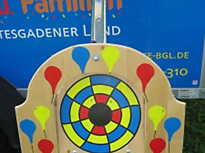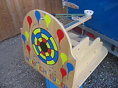 Bei diesem Gerät ist es wie beim Büchsenwerfen wichtig, hinten eine Prellwand zu haben, damit bei Bällen die danebengeworfen werden, der Spielleiter nicht so weit laufen muss. Ziel ist es, die Scheibe in der Mitte zu treffen, dann segelt der der Gegenstand der in die Maschine eingelegt wird durch die Luft ca. 4 Meter nach vorne zum Werfer. Werfen und Auffangen erfordert Geschicklichkeit und Reaktionsvermögen. Spannung ist garantiert. Tipp: Anstelle der Schokoküsse sind verpackte Kaubonbons (Mamba, Maoam, … ) besser geeignet